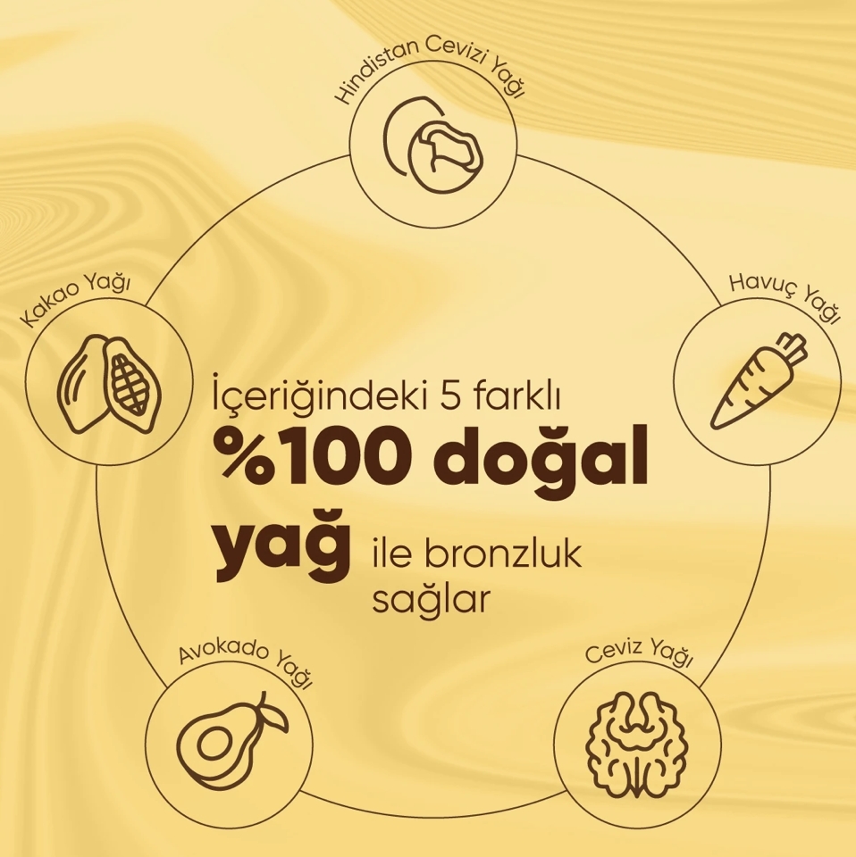 - %100 doğal bronzluk sağlarken, içeriğindeki değerli yağlar hindistan cevizi ve avokado yağı ile cildi nemlendirir ve besler. Kakao ve havuç yağı ile kalıcı bronzluğu destekler.