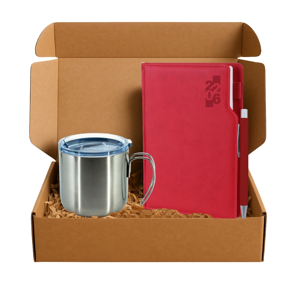Kırmızı ve gri tonlar, ofiste yeni yılı karşılamak için ideal bir kombin oluşturuyor. Ajanda ve kalem planlamayı desteklerken, termos günü keyifli hale getiriyor. Küçük ama etkili bir yılbaşı hediyesi.